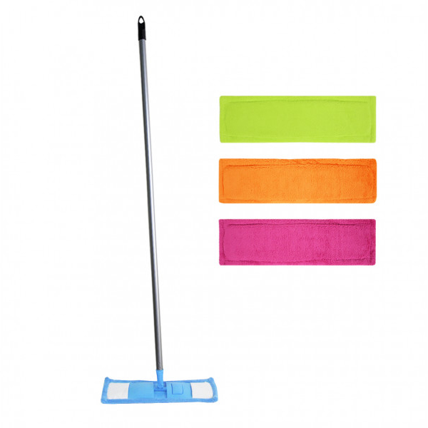 Швабра для прибирання з металевою ручкою та кнопковим механізмом. Основа підлогонатирача обладнана м'якою змінною насадкою з мікрофібри. Особливістю такої насадки є те, що дрібні волокна мікрофібри утримують удесятеро більше вологи, ніж їхня вага легко справляється з будь-якими забрудненнями.